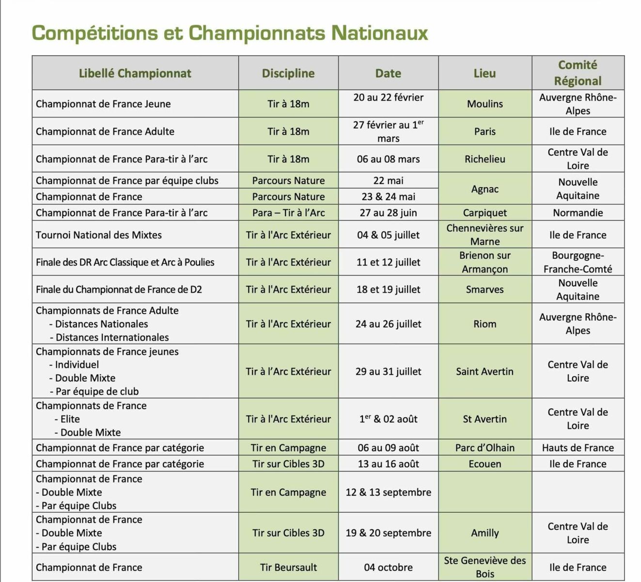 Tableau récapitulatif des Championnat de France 2025-2026.